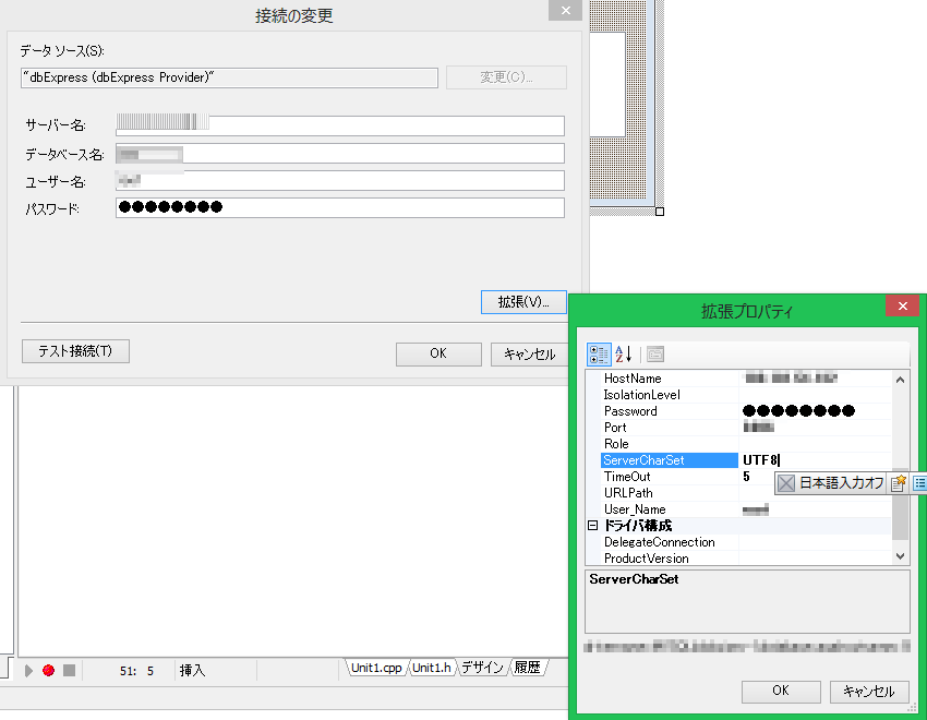 TSQLConnectionにParamsというプロパティがあり、そこに新たにパラメータを追加できるが、追加しても追加した直後は表示されているが、他のコンポーネントのプロパティなどをみるか、テスト実行した後で見てみると、追加したServerCharSet=utf8は消えているので、おそらく無視されている。